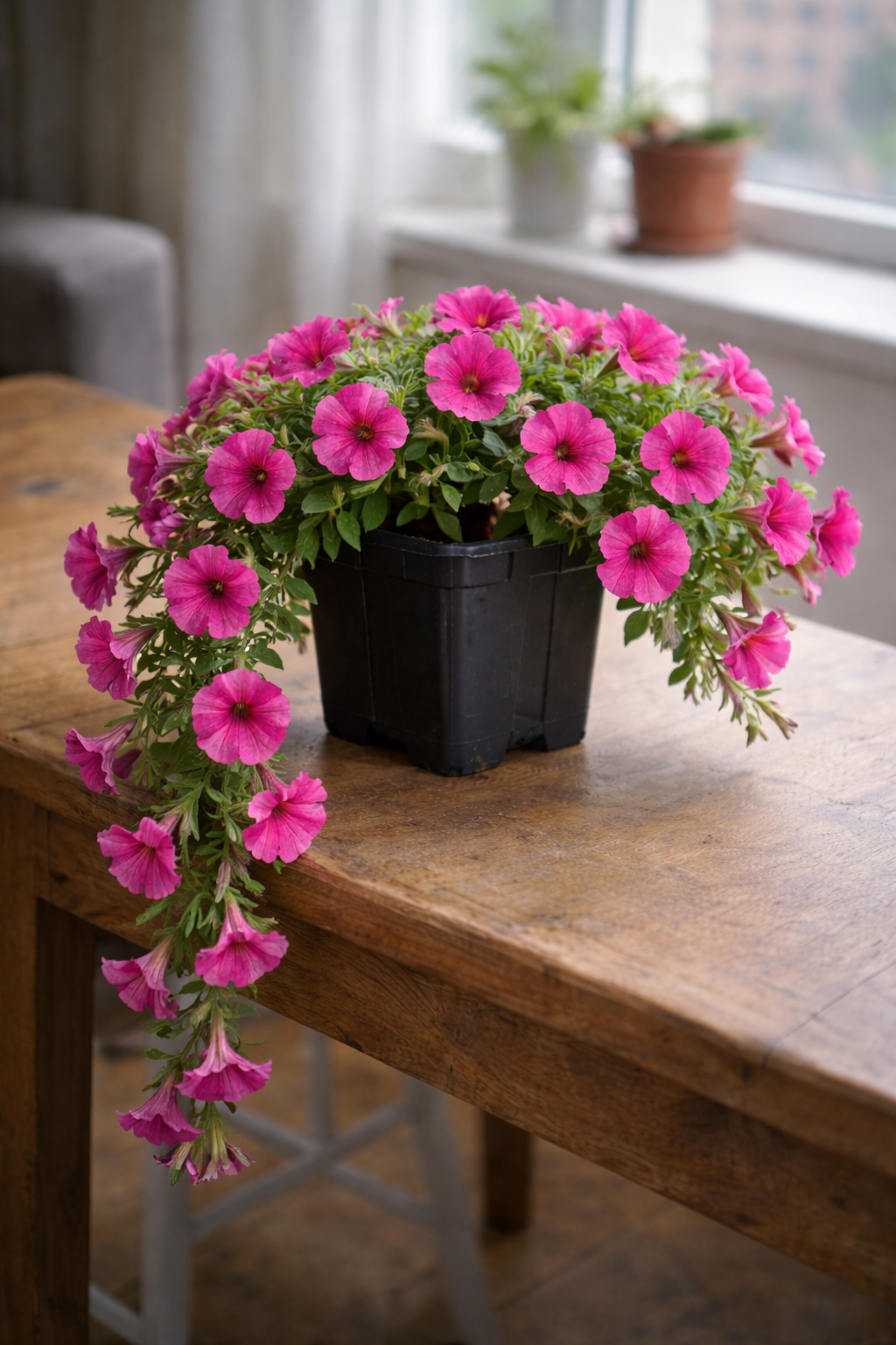 Каскадна петунія на підвіконні: охайний ріст і перші хвилі цвітіння.